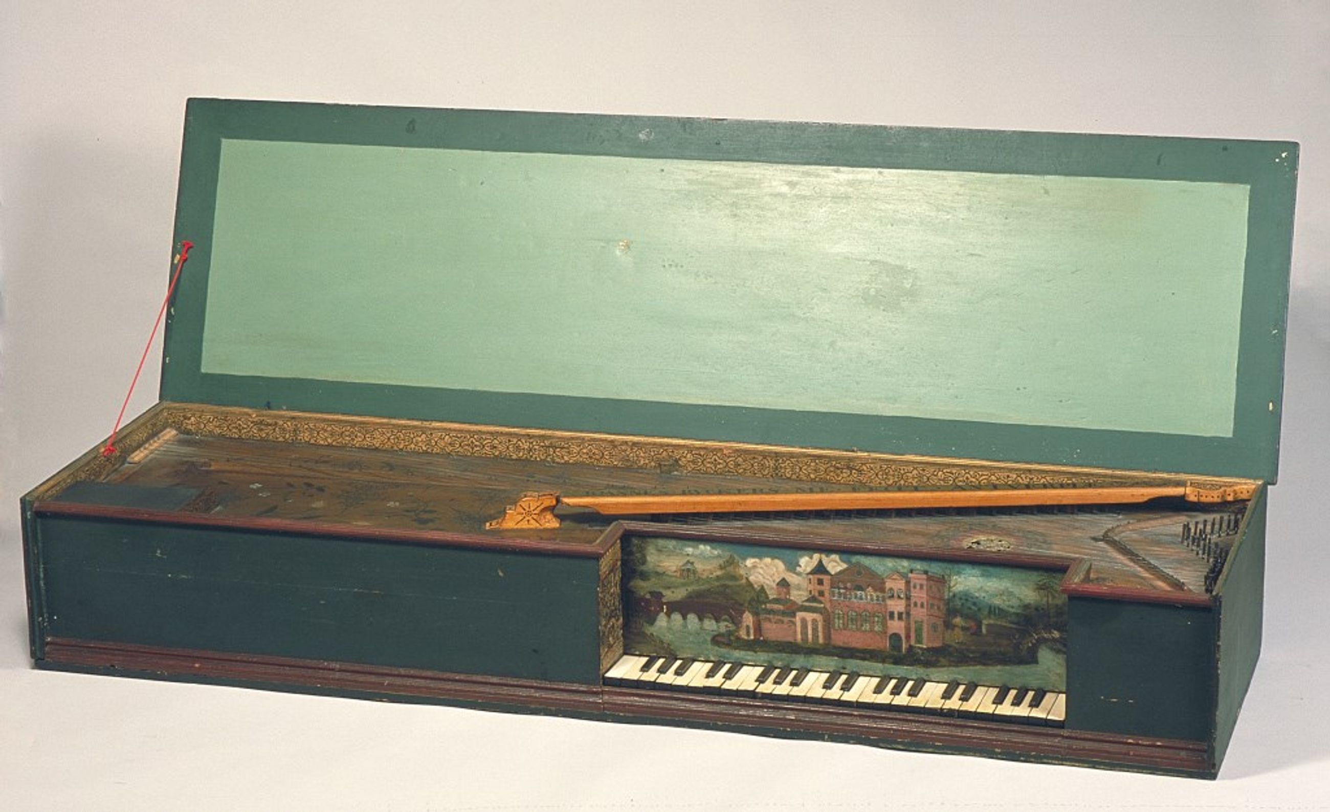 Caisse en tilleul peinte en vert, touches en tilleul, placages en os, papiers de décor d'origine sur les pourtours de la table. Décor peint au-dessus du clavier et sur la table.
