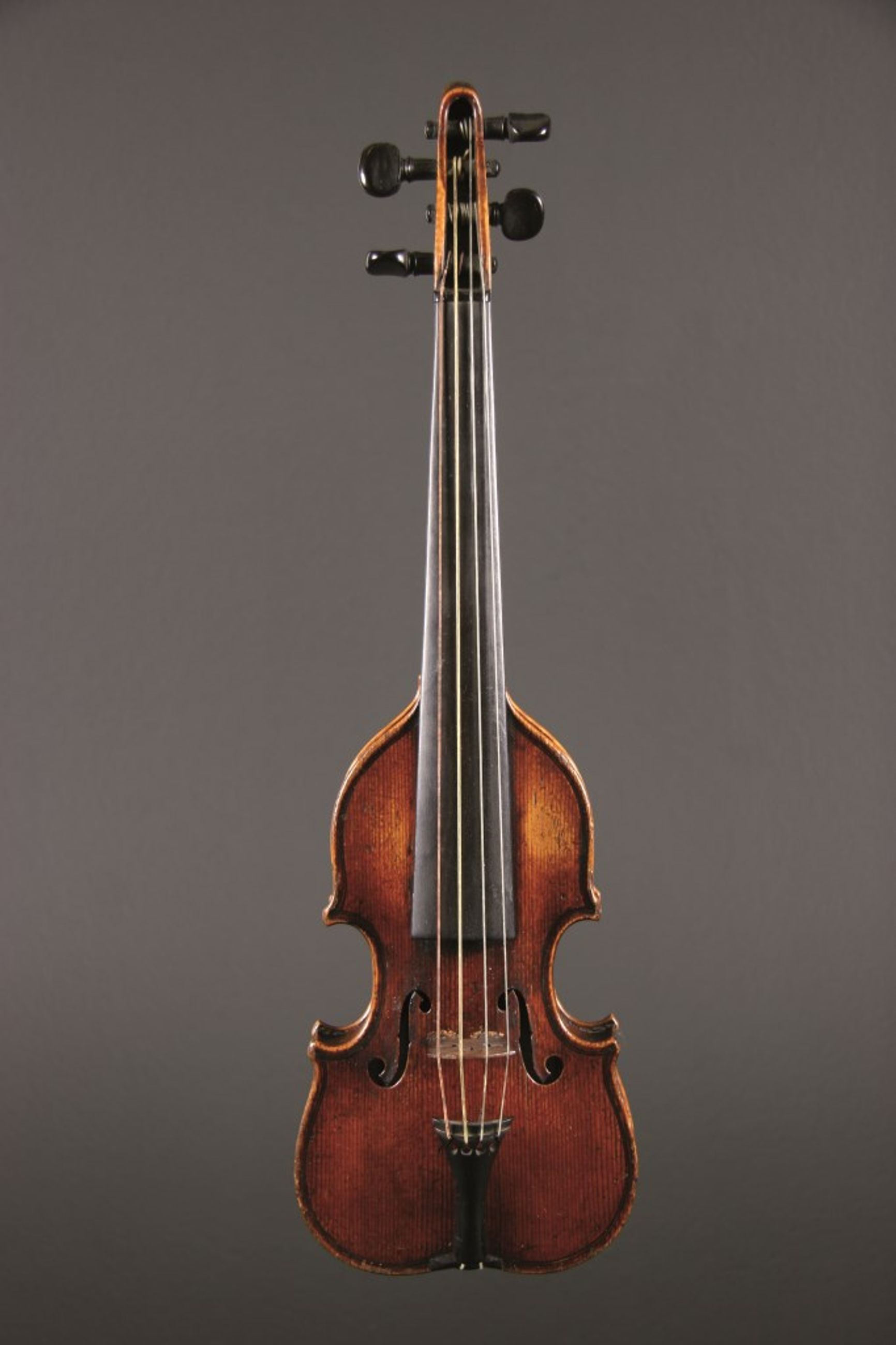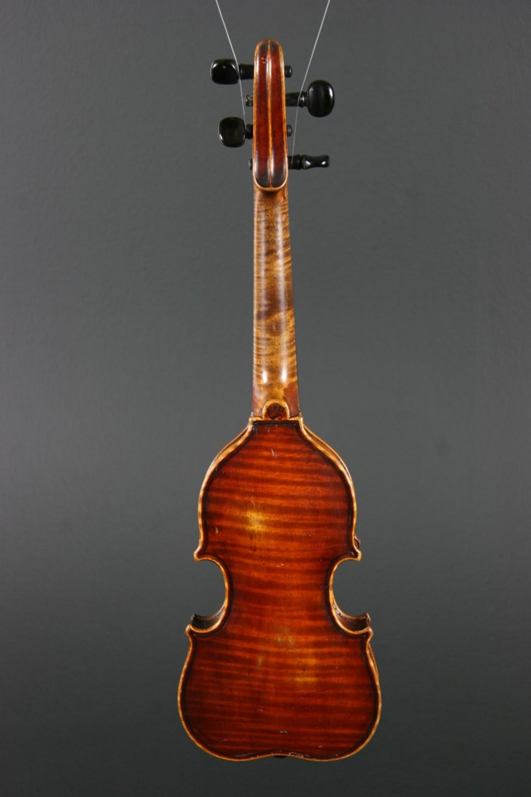 Instrument en bois résineux à fibres assez larges. Dos en une pièce d'érable ondé. Eclisses en érable ondé. Cordier, touche et chevilles en ébène. Vernis brun rougeâtre.