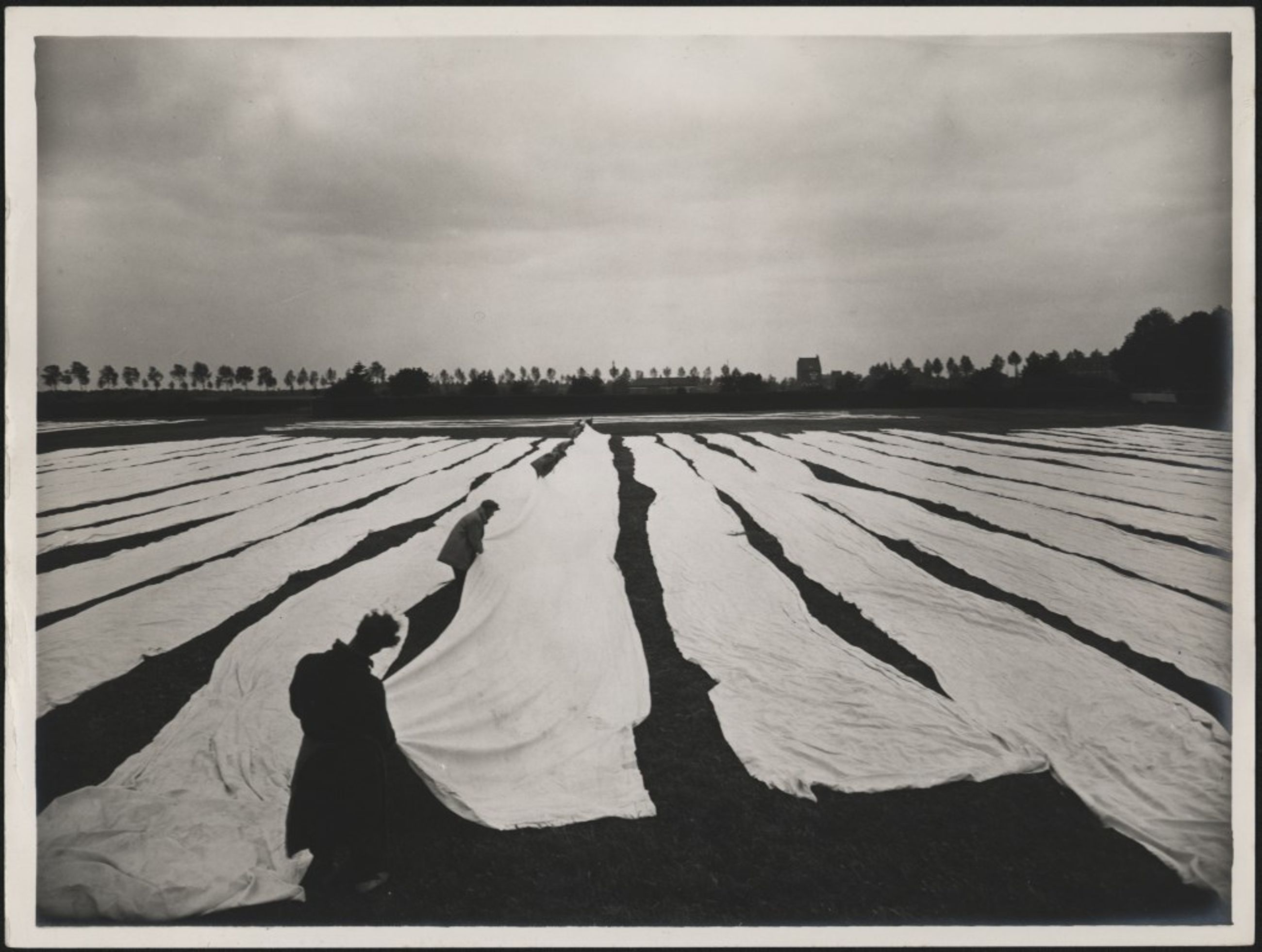 On donne le nom de blanchiment à l'ensemble des opérations permettant de dépouiller les fils, ici les toiles de tissus, des substances qui les souillent et de les décolorer. Entre de nombreuses étapes (trempage, lavage, lessivage...), les toiles sont étendues dans les prés pour le séchage.
