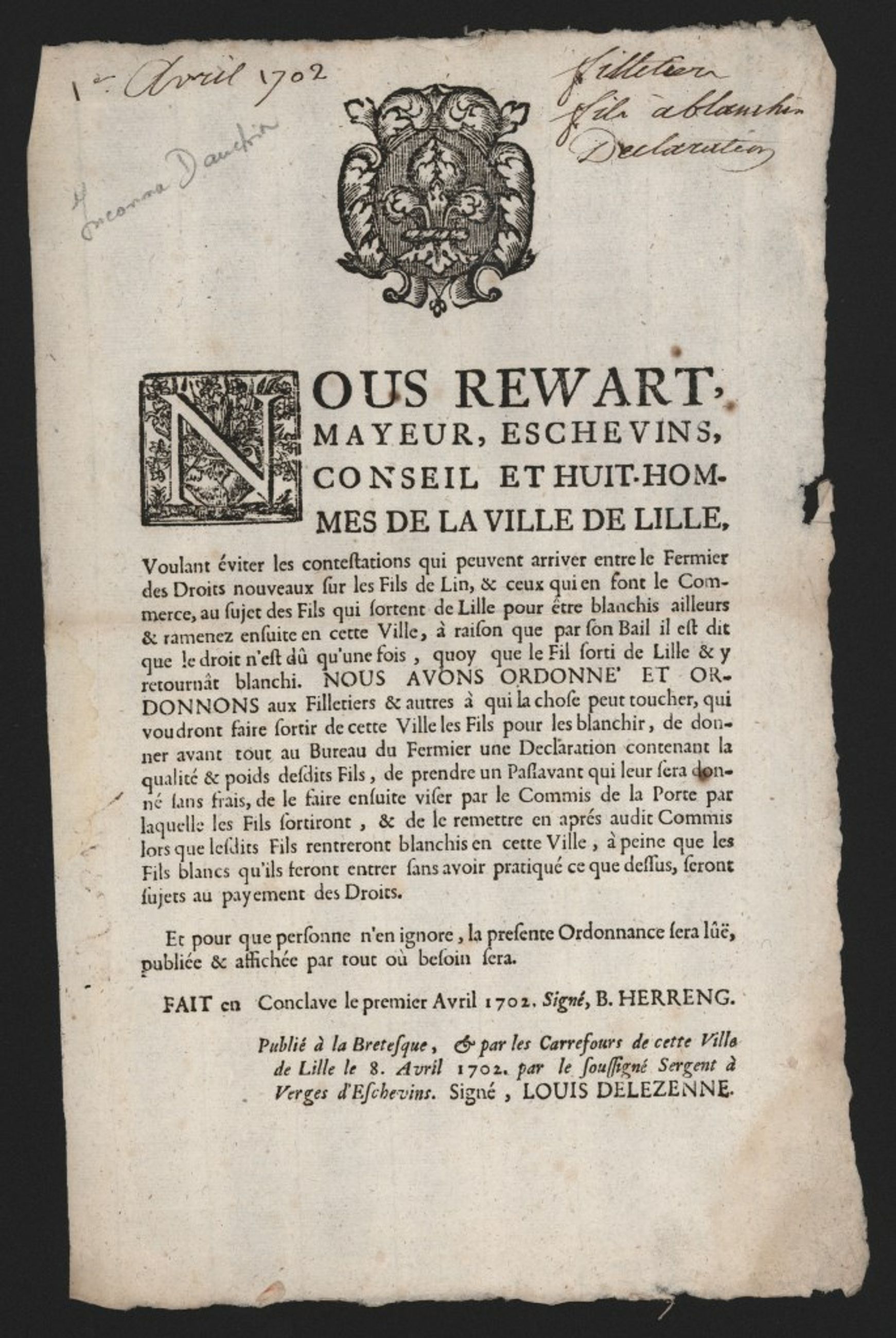 "NOUS REWART, / MAYEUR, ESCHEVINS, / CONSEIL ET HUIT HOM-/MES DE LA VILLE DE LILLE. / voulant éviter les conteftations qui peuvent arriver entre le Fermier / des Droits nouveaux fur les Fils de Lin, & ceux qui en font le Com-/merce, au fujet des Fils qui fortent de Lille pour être blanchis ailleurs / ramenez enfuite en cette Ville, à raifon que par fon Bail il eft dit / que le droit n'eft dû qu'une fois, quoy que le Fil forti de Lille & y / retournât blanchi. NOUS AVONS ORDONNE ET OR-/DONNONS aux Filletiers & autres à qui la chofe peut toucher, qui / voudront faire fortir de cette Ville les Fils pour les blanchir, de don-/ner avant tout au Bureau du fermier une declaration contenant la qualité & poids defdits Fils, de prendre un Paflavant qui leur fera don-/né fans frais, de le faire enfuite vifer par le Commis de la Porte par laquelle les Fils rentreront blanchis en cette Ville, à peine que les / Fils blancs qu'ils feront entrer fans avoir pratiqué ce que deffus, feront / fujets au payement des Droits. / Et pour que perfonne n'en ignore, la prefente Ordonnance fera lûë, / publiée & affichée par tout où befoin fera. / FAIT en Conclave le premier Avril 1702. Signé, B. HERRENG. / Publié à la Bretefque, & par les Carrefours de cette Ville / de Lille le 8. Avril 1702. par le fouffigné Sergent à / Verges d'Efchevins. Signé, LOUIS DELEZENNE."