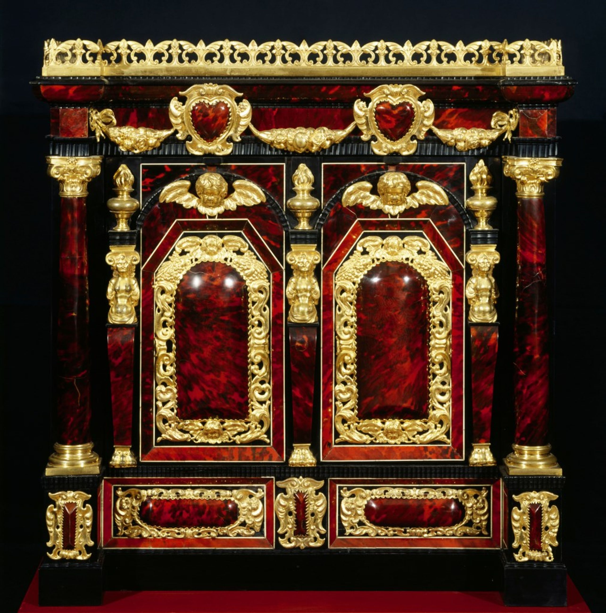 Bâti en bois rehaussé d'écailles de tortue, bois précieux et cuivre doré. A l'intérieur, le plafond est décoré de satin blanc et broderie métallique (pélican).