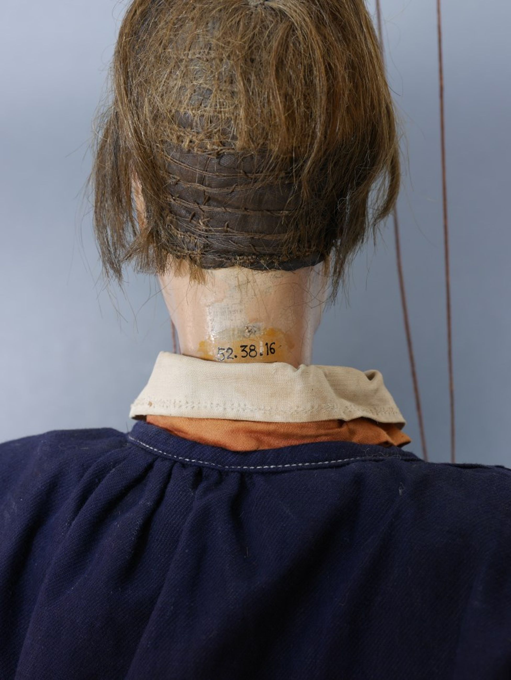 Bois polychrome (tête et mains), cheveux naturels pour la perruque, coton pour les vêtements.